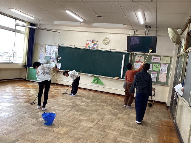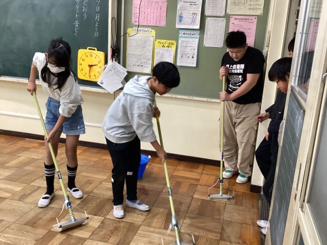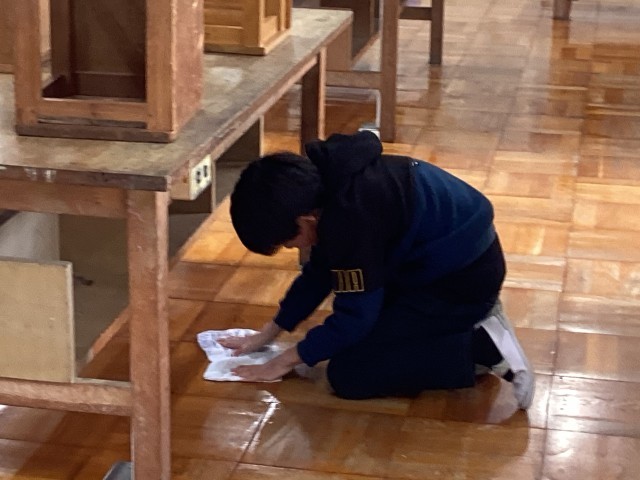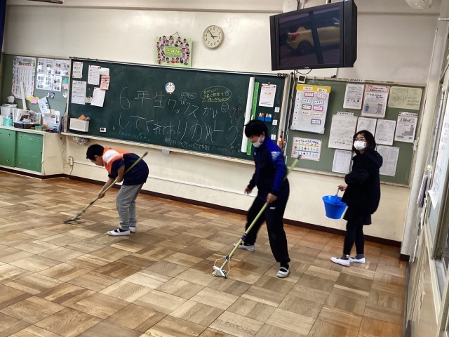 5・6時間目に6年生が奉仕作業を行いました。6年間いろいろな場面で使ってきた各教室のワックスがけをマス目に沿って丁寧に拭きあげ、ピカピカになりました。「大感謝祭!」と感謝の気持ちを込めて作業することができました。とても清々しい雰囲気でした。