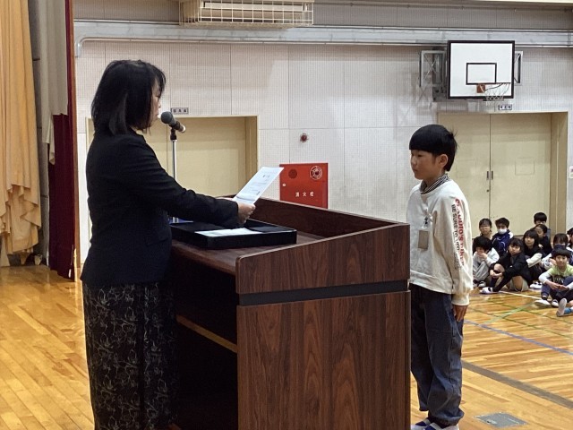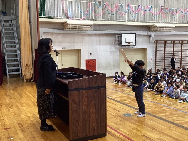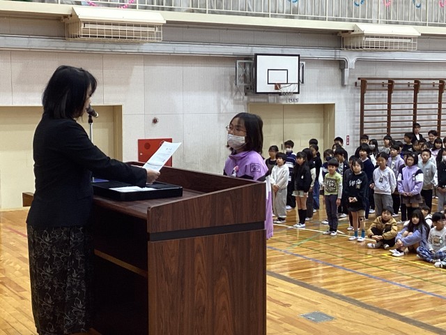 1年生と4年生の代表児童が1年間の反省と新しい学年に向けての決意について発表してくれました。その後、各学年の代表者が修了証を受け取りました。4月から進級し、頑張るぞ!という意欲が伝わってくる修了式でした。