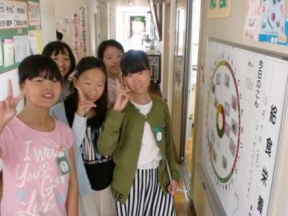 班長チェックの近くで、給食委員が今日の献立を給食栄養表に分類してくれていました。