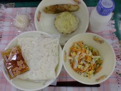 冷やしうどん ちくわの磯辺揚げ さつまいもの天ぷら 梨
