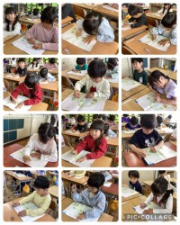 図工の時間に、絵の具で「にじいろのさかな」を塗りました。まずは、赤・黄・青の単色で顔やしっぽなどを塗りました。それから、「赤+青」「青+黄」「黄+赤」に色を混ぜ、うろこを塗っていきました。一学期に比べて、水の量の調整に気をつけたり、はみ出さずに塗ったりできるようになりました。