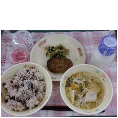 赤飯 ハンバーグの照り焼き 土佐和え 湯葉のすまし汁 さくらゼリー
