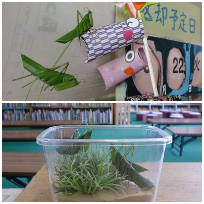 ラビットさんがバッタのオブジェを作ってくださいました。本物みたいでしょ。何でできていると思いますか?バッタはおとぎの森と学びの森にいます。みなさん、見にきてくださいね。