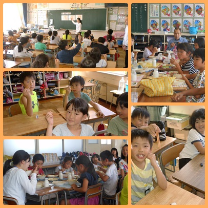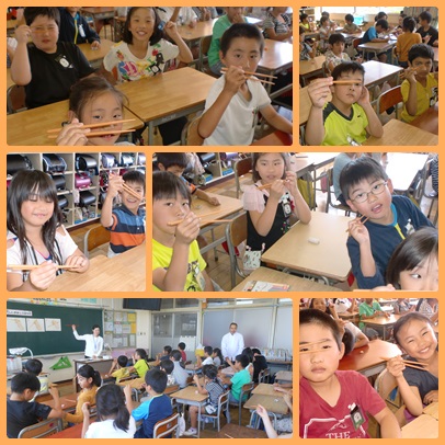 栄養士さんと調理員さんと一緒に給食を食べたあと、正しいおはしの持ち方を教えていただきました。