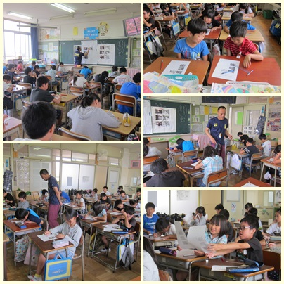3教科の授業の様子です。図工では一点透視図法を教えていただき、ポスターに挑戦しています。理科は電池の働きについて学習しています。音楽では姿勢よく歌って、美しい歌声を響かせました。