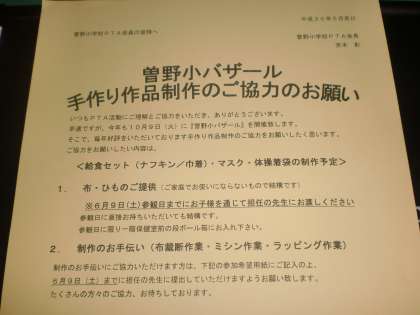 10月9日(火)に行われるバザールへの協力をお願いします。提供品や参加希望用紙の提出が6月9日(土)までになっています。よろしくお願いします。
