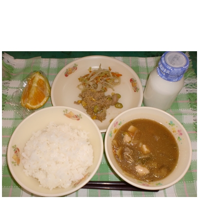 豚汁 ツナそぼろ丼 もやしとキャベツのごま和え オレンジ