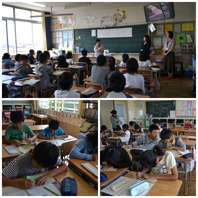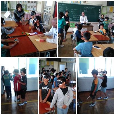 点字と盲人体験のようすです。みんな真剣に取り組んでいました。