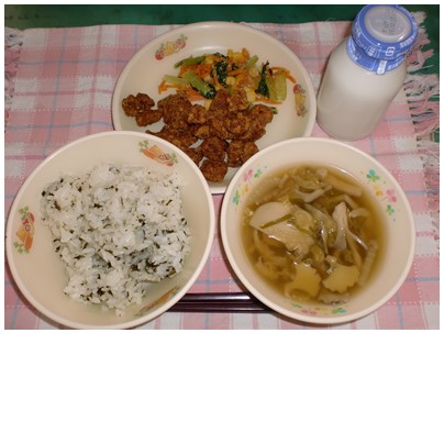 戻りがつおの更紗(さらさ)あげ 小松菜のごまあえ 里山汁