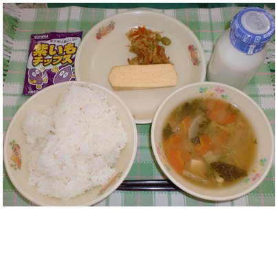 切り干し大根の煮物 厚焼き卵 豆腐と大根のみそ汁 桜イモチップス