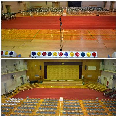明日の朝、体育館の開場は8:30です。天候が心配されますが、暖かい格好をして、安全にお越しください。お車での来校はご遠慮ください。子どもたち、職員一同お待ちしています。(どこに座るとお子様がよく見えるか、確認してきてくださいね。)