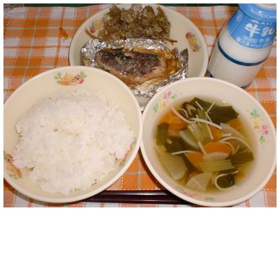 さばの銀紙焼き 豚肉とごぼうの炒め煮 青菜の五目汁
