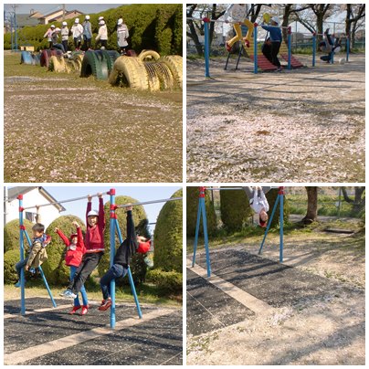 登校後の学習準備を終えた後、たくさんの子が運動場で遊んでいます。昨晩の雨で落ちた桜の花びらが運動場にたくさんありました。
