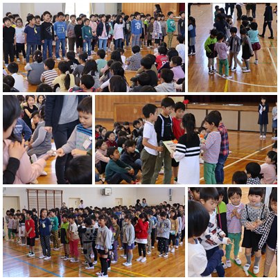 1・2あくしゅの会をしました。2年生から1年生に、あさがおの種をプレゼントしたあと、じゃんけん列車をしました。1年生と2年生がなかよくなれました。