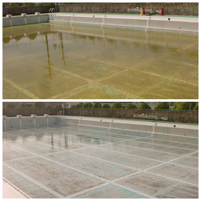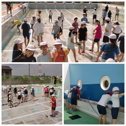 6年生がプールをきれいにしてくれました。9月〜5月まで使われなかったプールは大変汚れていました。来週火曜日から使えるように、きれいにしてくれてありがとうね。