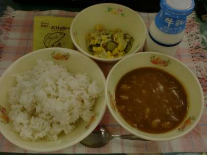 カレーライス コーンサラダ 乾燥小魚