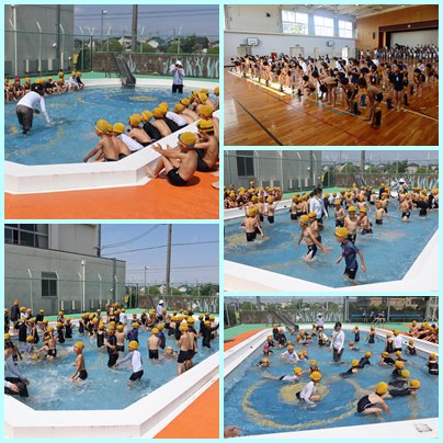今日、プールびらきをしました。プールのルールを確認した後、みんなで楽しく気持ちよく水浴びをしました。
