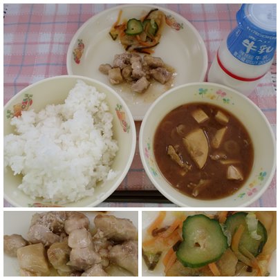 つぼ漬けと白菜の塩昆布和え 鶏肉の生姜だれかけ 豚汁
