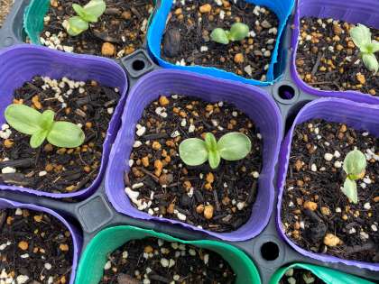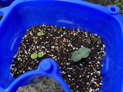 とうとう3年生のみんなの青いプランターにホウセンカとオクラも小さな2枚の葉が出ました!どちらがホウセンカで、どちらがオクラかわかりますか?
