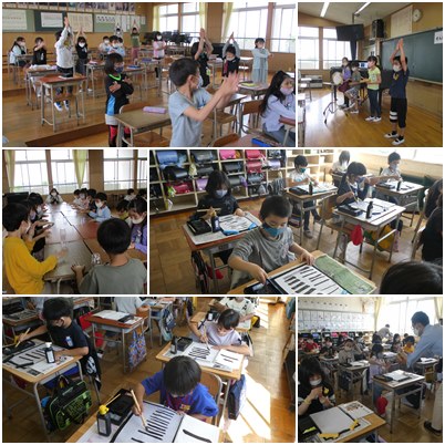 音楽の授業では「3時のおやつゲーム」をしたり、「小さな世界」の歌に合わせてカップを移動させたりと、リズムを楽しむ学習をしました。