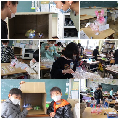 動物の作品の下にライトを置いて、きれいに光らせました。