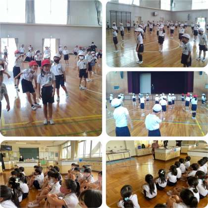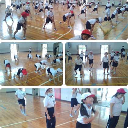 体育では、3クラス合同で体つくりの運動遊びを行いました。