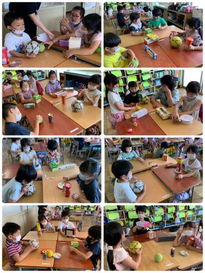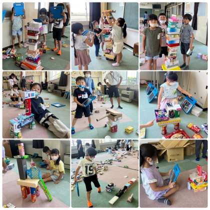 いろいろな形をした箱を使って、キリンや車を作りました。たくさんの箱を提供していただき、ありがとうございました。