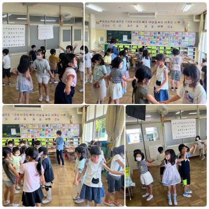 わらべ歌の「なべ なべ」に合わせて、なかよく踊りました。