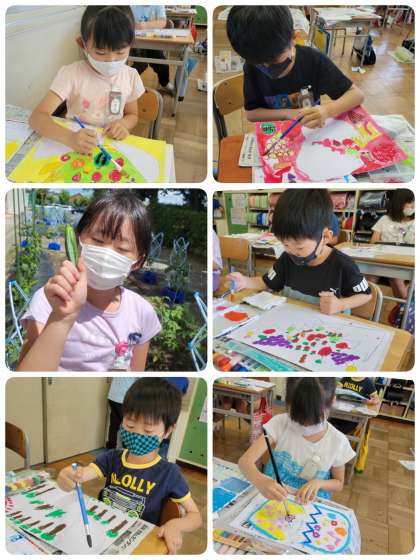 図工「ふしぎなたまご」がいよいよ完成です。カラフルな卵が割れてでてくる世界が広がります。クレヨンと水彩絵の具で塗りました。