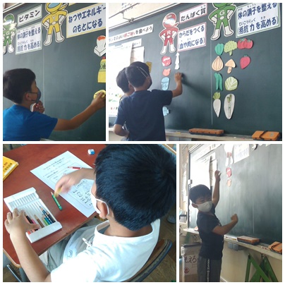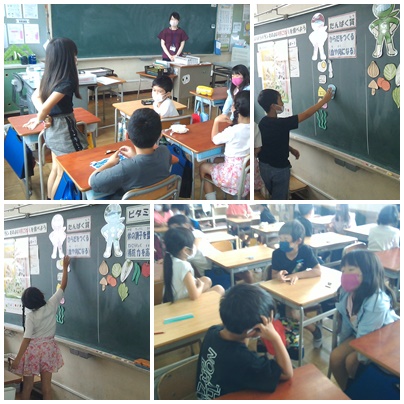 1.2組は,来週から始まる生活リズムチェックに向けて養護教諭の先生の授業がありました。一人一つ食材をもらい,どこの栄養素に分けることができるのかを楽しみながら学びました。3組は明日です。