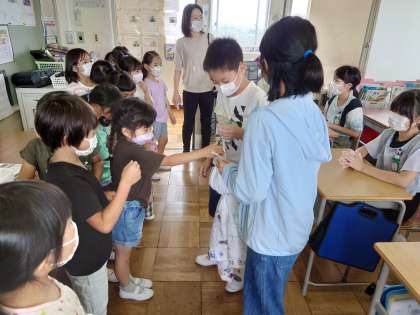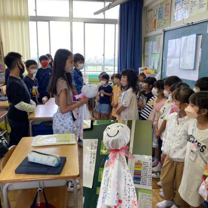 1年生が大きなテルテル坊主を作って届けてくれました(^o^)