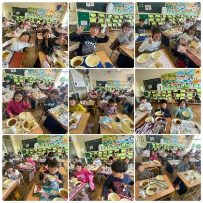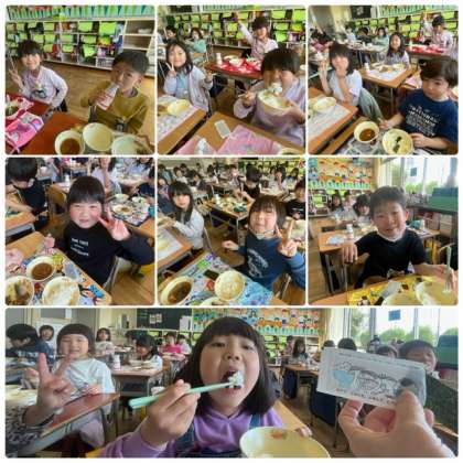 焼き海苔の袋に、1年生が描いた絵がプリントされていました。描いた子が、絵と同じポーズでごはんを食べていました。みんないい顔です。