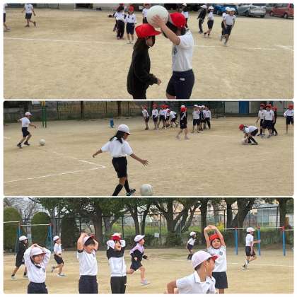 体育では、ボールけり遊びをしています。楽しくボールを蹴っています。