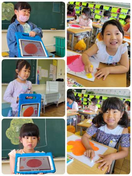 図工では、「にこにこ おひさま」の絵をかきました。タブレットで写真を撮り、お友達の作品の素敵なところを発表することができました。