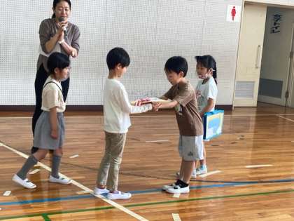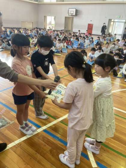 1年生に、アサガオの種をプレゼントしました。各クラスの学級委員が代表で渡しました。