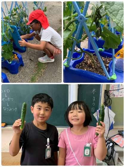 自分が育てたい野菜の苗を植えてから、1ヶ月が過ぎました。毎朝、登校したらすぐに水やりをしたり、野菜の様子を観察したりしています。成長の過程を、タブレットのカメラで撮っています。トマトやキュウリやナスは、花が咲き、実もなっています。本日、キュウリを収穫しました。自分が育てた野菜の味はどうかな?