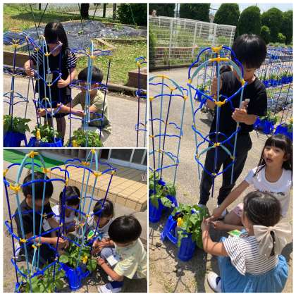 あさがおの葉が増えて、つるが出てきました。みんなで支柱をたてました。