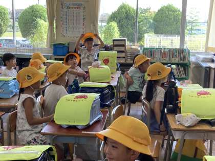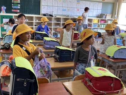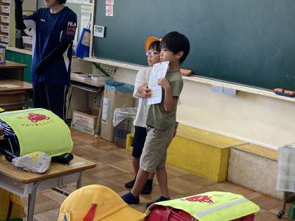 1年生は5時間授業で帰りの会をします。明日の連絡や忘れ物がないかの確認、最後は元気にさようならの挨拶をしました。