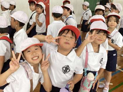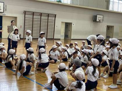 運動会に向けて、体育館でデカパンの練習と徒競走の順番の確認をしました。