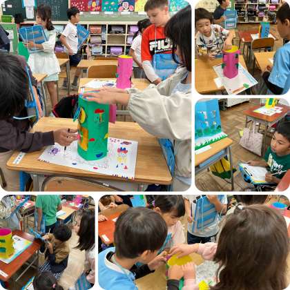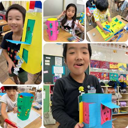 図工で「まどから こんにちは」という作品を作りました。それぞれまどの形や開き方を考え、どんなものが「こんにちは」するのか考えて作ることができました。