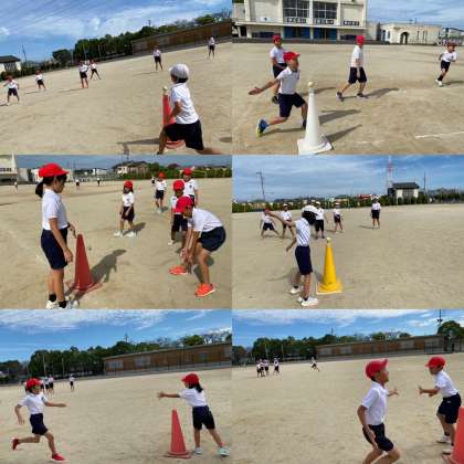 体育のハンドベースボール、だんだん慣れてきて、どこに打ったら相手が取れないか考えて打ったり、どうやったら早くアウトにできるか考えて動けるようになってきました。