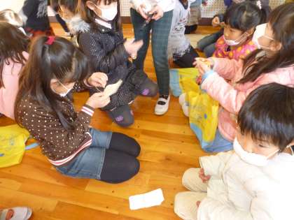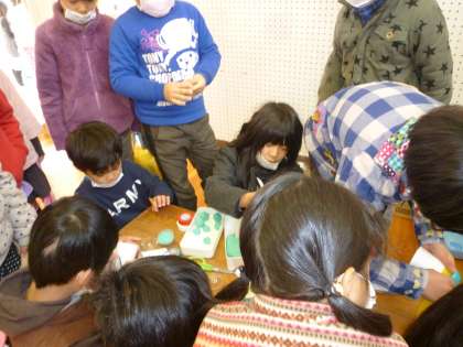 2年生のお兄さん、お姉さんが「おもちゃまつり」に招待してくれました。                                              おもちゃの材料のひとつひとつまで、しっかり準備して待っていてくれた2年生。作り方もやさしく教えてくれました。