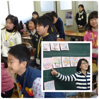 習った単語を、空の乗り物、地上の乗り物、地下の乗り物に分けて、ジェスチャーを取り入れながら楽しく発音しました。