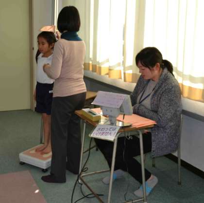 3学期に入ってから、学年ごとに身体測定を行っています。2学期と比べて、どれだけ体が成長したか確認しました。