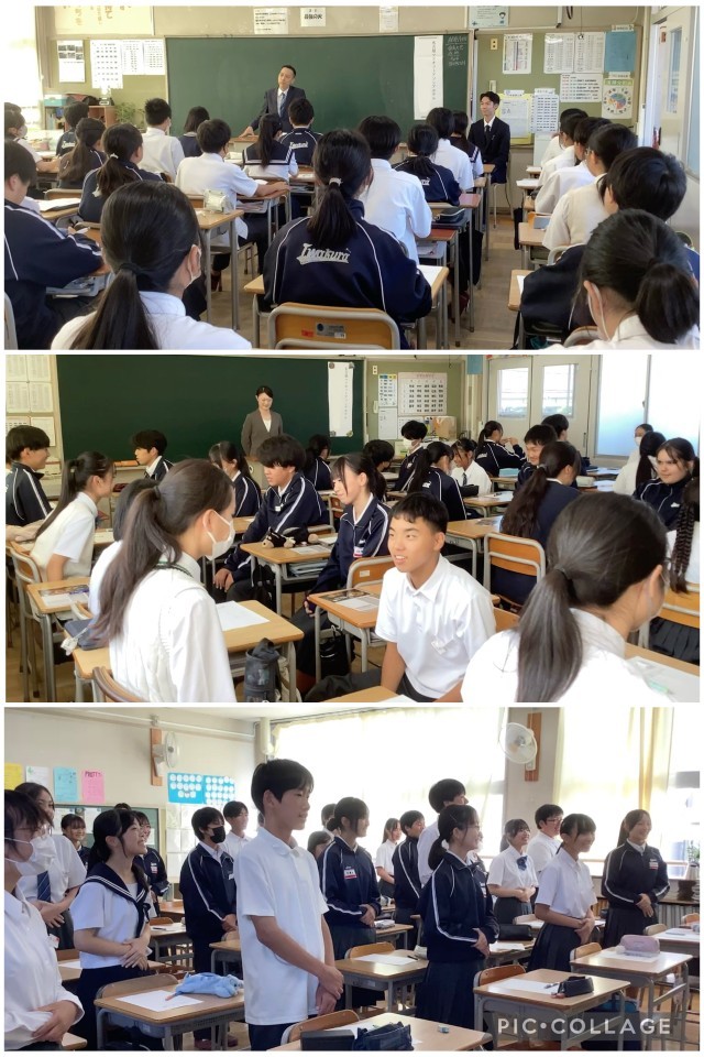 本日の6時間目は、職場体験に向けてマナー講座を行いました。実際にホテルにお勤めの方々を講師としてお招きし、話を聞く態度や身だしなみ、あいさつ、言葉遣いなど、社会人としてすぐに役立つマナーを学ぶことが出来ました。