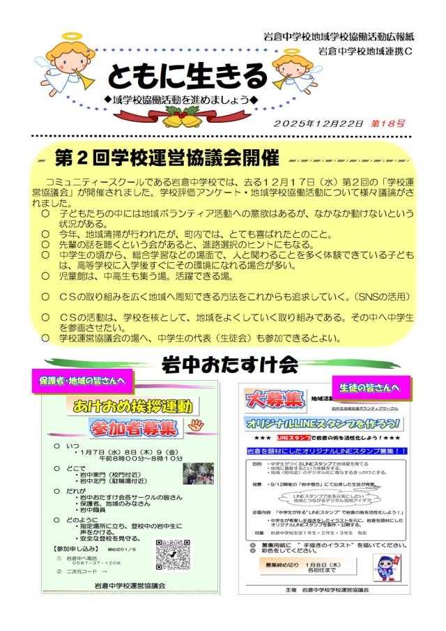 岩中地域課学校協働本部からの広報紙です。第2回の学校運営協議会について掲載しました。また、その場で協議されましたおたすけ会の活動についても掲載しました。