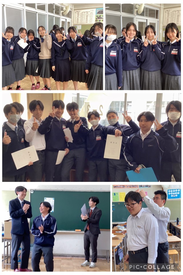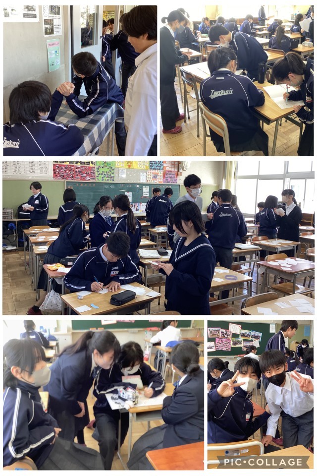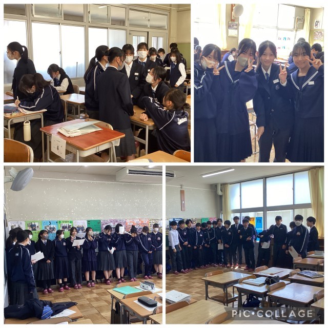 式後の学活では、担任より1年間の振り返りとともに通知表が手渡されました。また、生徒から担任へ、感謝の気持ちを込めた歌やメッセージカードが送られるなど、心温まる場面も見られました。学級の仲間や先生との別れに涙する姿もあり、この1年の積み重ねを感じるひとときとなりました。