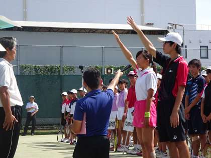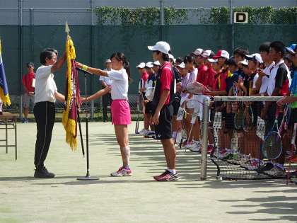 開会式で、昨年度優勝校である本校女子テニス部が優勝旗返還を行いました。