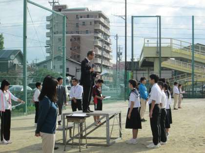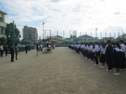 本日は朝礼を行いました。はじめに、後期生徒会任命式と委員会任命式がありました。続いて、表彰伝達では、愛知科学の甲子園、水泳部、女子ソフトテニス部、少年の主張、パソコン部の表彰がありました。校長先生の話では、夢や希望をもって生活していくために、吉田松陰の言葉が紹介されました。