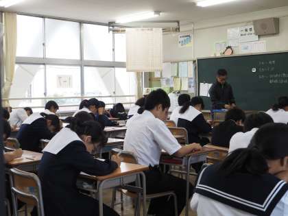 左の写真は、朝の時間に行われた社会科のステップテストの様子です。どのクラスも、皆で満点を取ることを目標にし、本番のテストに挑んでいました。短い時間で受けるテストですが、注ぐ情熱の大きさは変わらないはず。こつこつと、できることを積んでいきたいですね。
